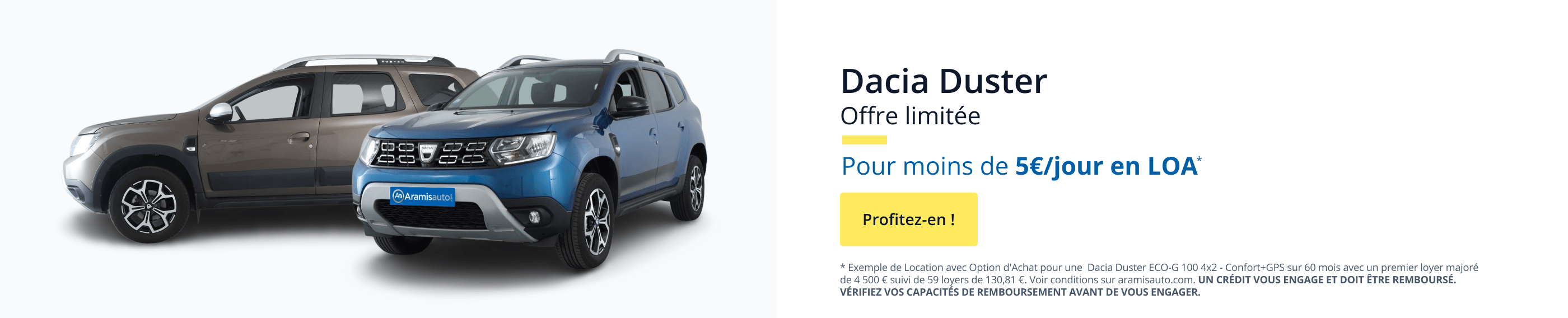 Exemple de Location avec Option d'Achat pour une Dacia Duster ECO-G 100 4x2 - Confort+GPS vendue au prix de 16 390€, sur 60 mois et 50 000 km avec un premier loyer majoré de 4 500€ suivi de 59 loyers de 130,81€, (soit 1569,72€ par an donnant 4,30€/jour) hors assurance facultatives, frais de transports et options additionnelles*