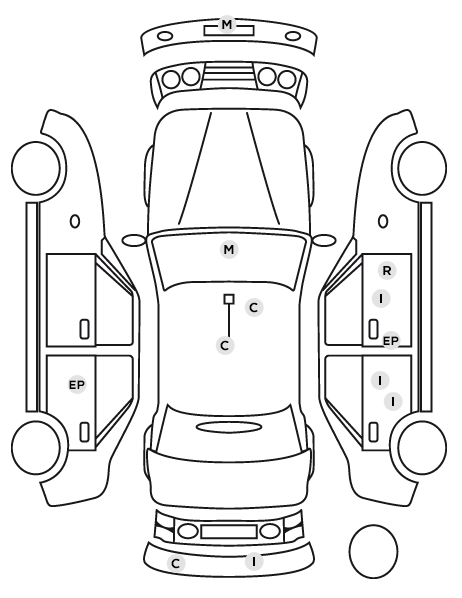 | Caméra de recul Rear view avec visualisation de la zone située à l'AR du véhicule sur l'écran de la radio ou de la radionavigation |